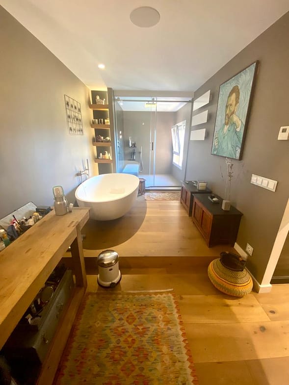 Home domótica includes a fully interesting music sound system, automatic blinds, air conditioning, and gas heating, all of which can be controlled from a phone or iPad. In the lounge, there is a pulldown projector screen.