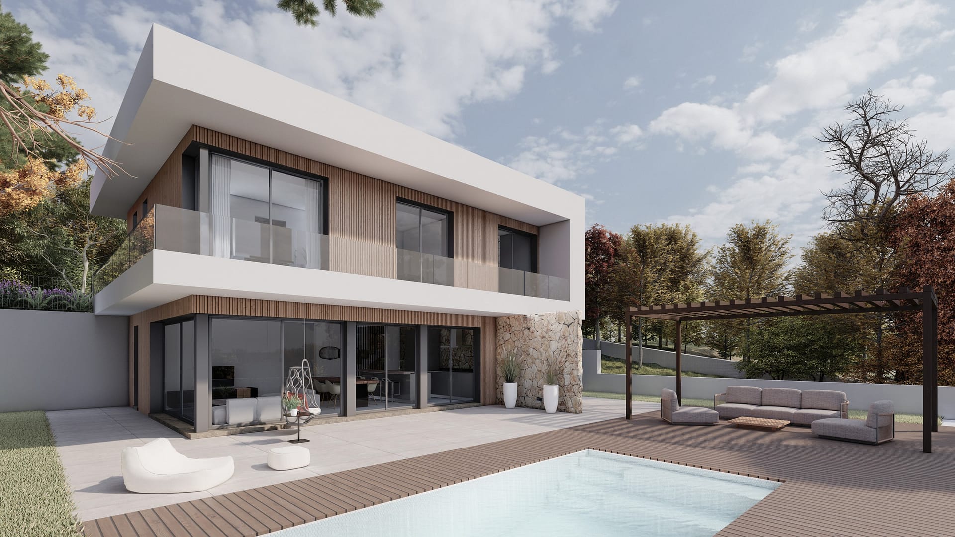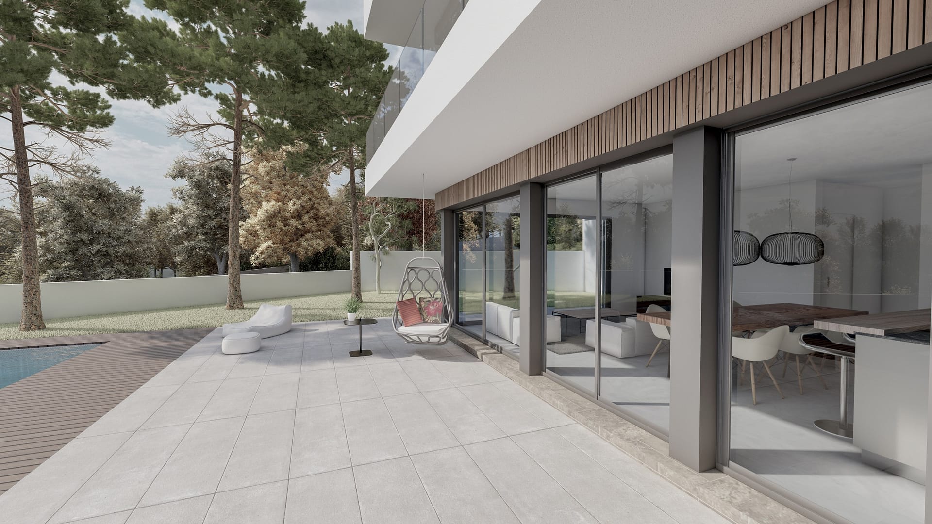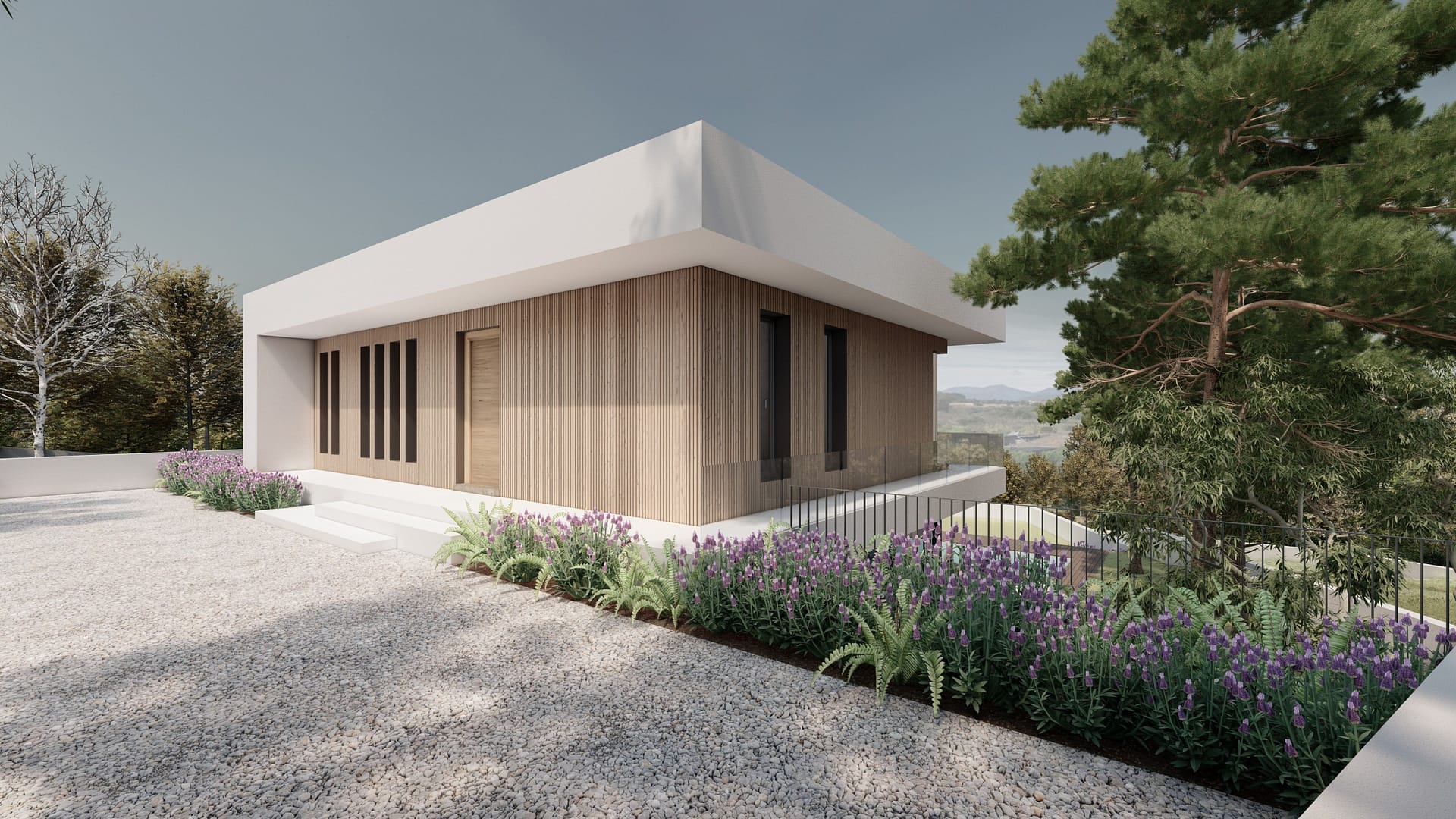 PROJECT FOR SALE WITH BUILDING LICENSE FOR SINGLE-FAMILY HOUSE AND LAND. The project includes a house with a constructed area of 218m2 distributed over two floors. The first floor consists of a large living/dining room with an open kitchen, a complete bathroom, utility and washing rooms, a den, and two porches. On the second floor, there are 3 double bedrooms (one with dressing room and bathroom en suite), another bathroom, and a terrace of 17m2.