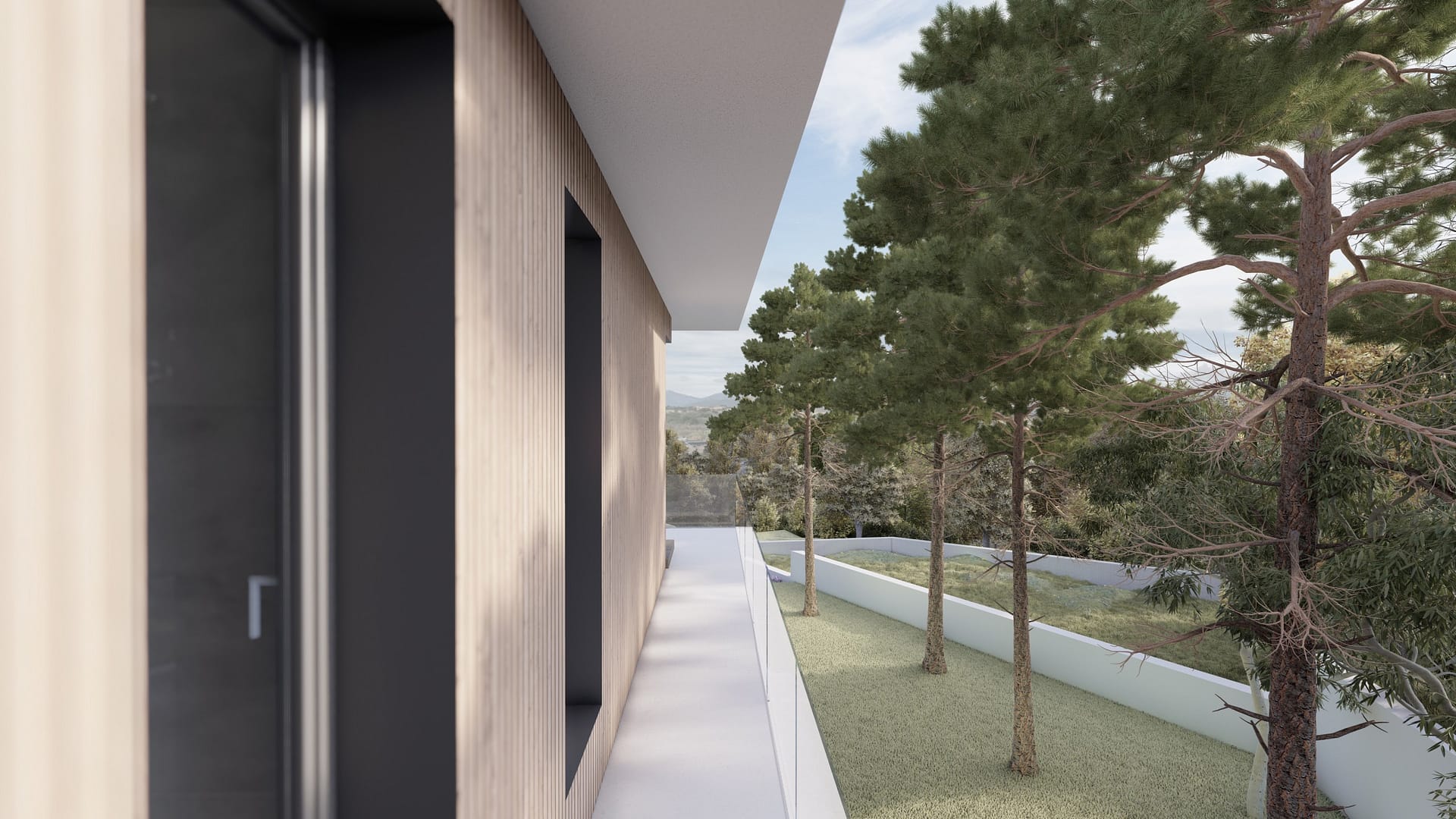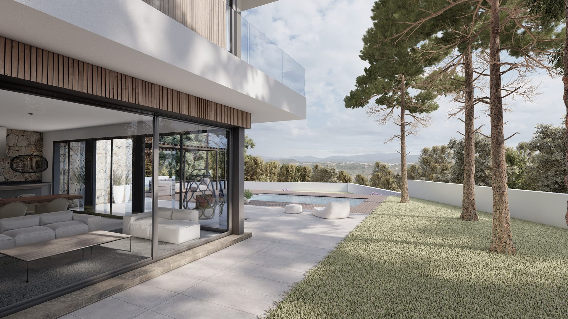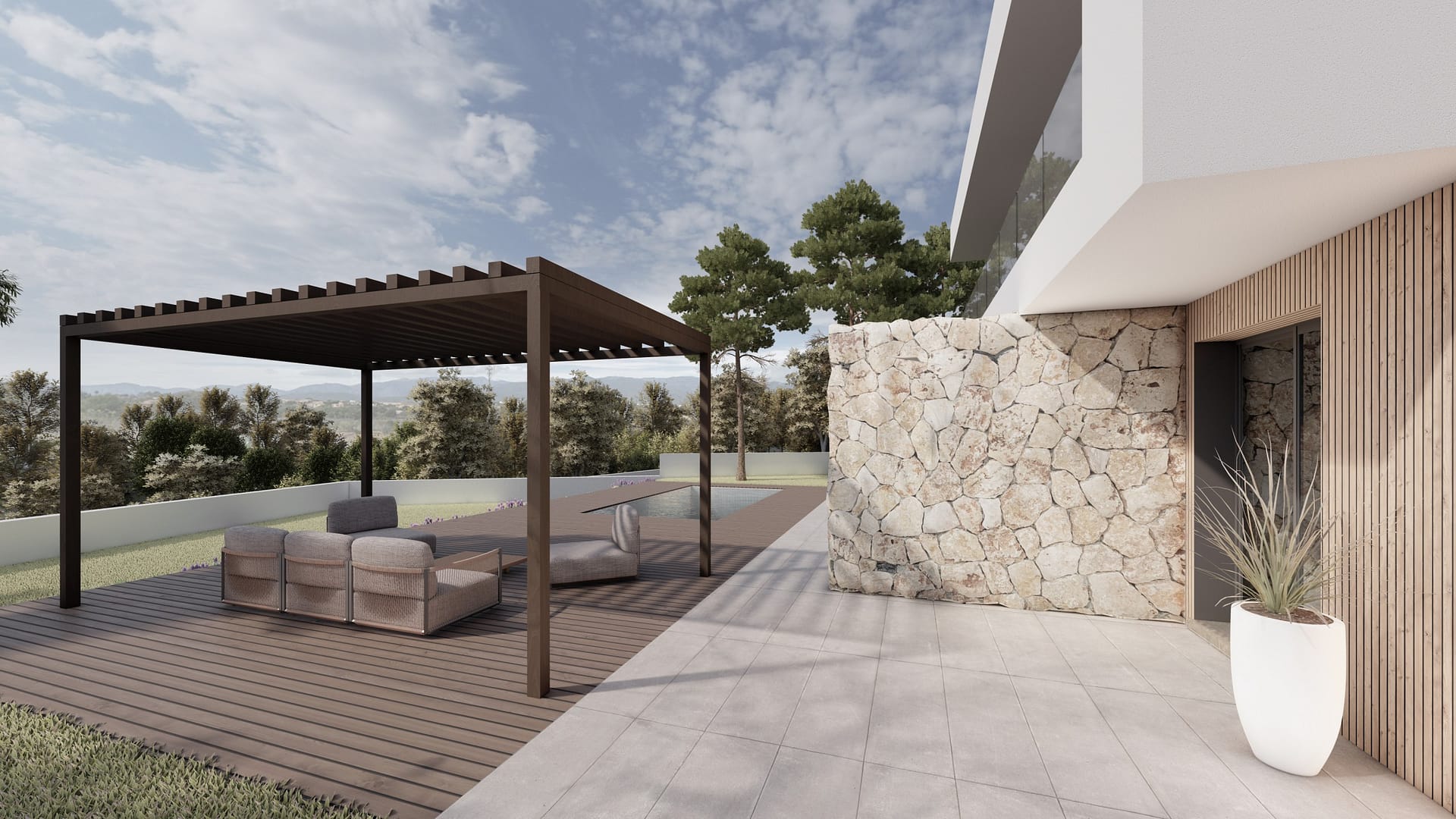 PROJECT FOR SALE WITH BUILDING LICENSE FOR SINGLE-FAMILY HOUSE AND LAND. The project includes a house with a constructed area of 218m2 distributed over two floors. The first floor consists of a large living/dining room with an open kitchen, a complete bathroom, utility and washing rooms, a den, and two porches. On the second floor, there are 3 double bedrooms (one with dressing room and bathroom en suite), another bathroom, and a terrace of 17m2.